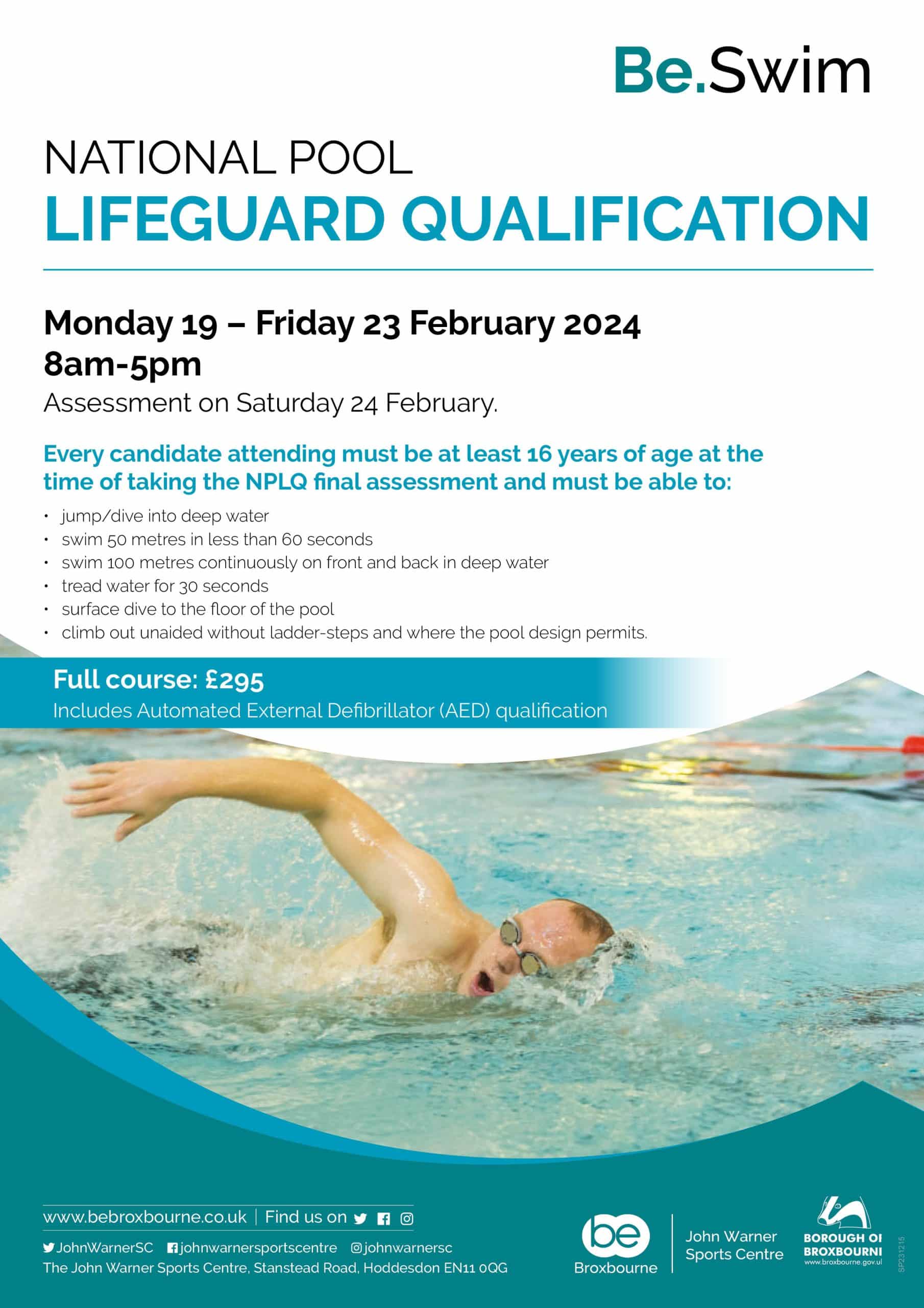 The next National Pool Lifeguard qualification course is TBC. Please register your interest. This course includes the AED qualification.